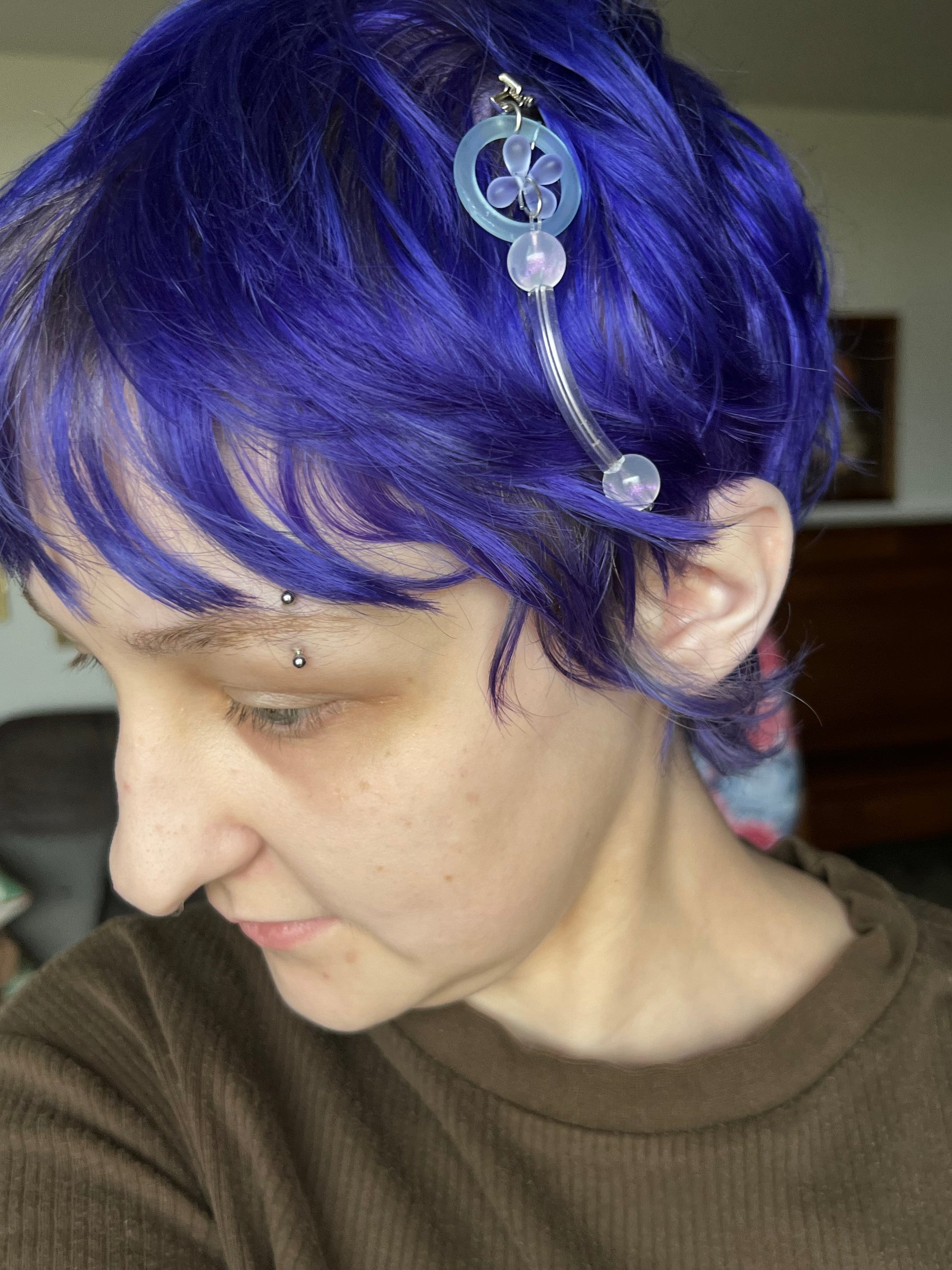 3.5” single clip for hair or clothing. Glass beaded charms, iridescent acrylic beads, monofilament, stainless steel alligator clip and hardware.