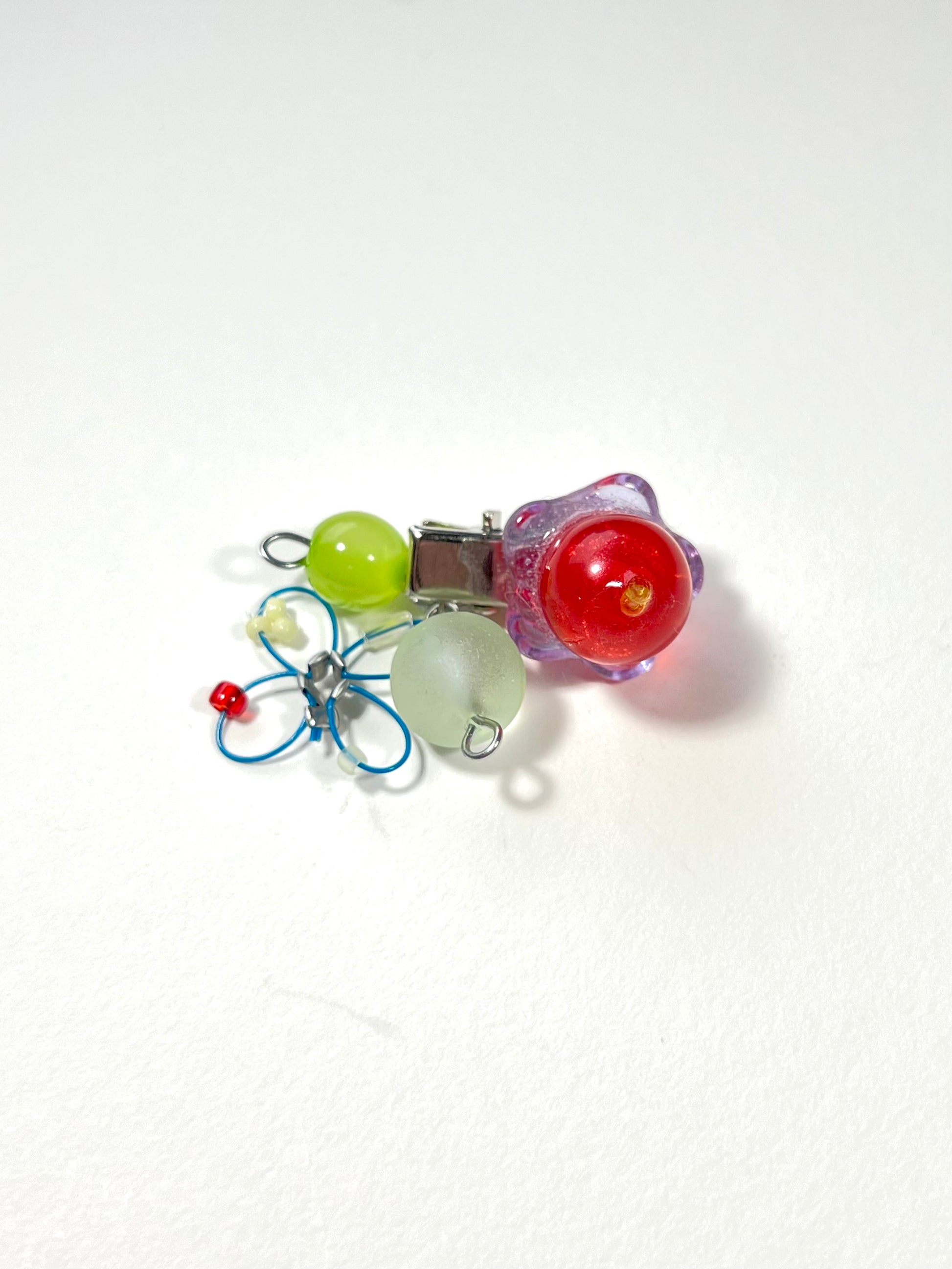 1.25” single clip for hair or clothing. Glass beaded charms, red acrylic bead, soft-flex beading wire, stainless steel alligator clip and hardware.